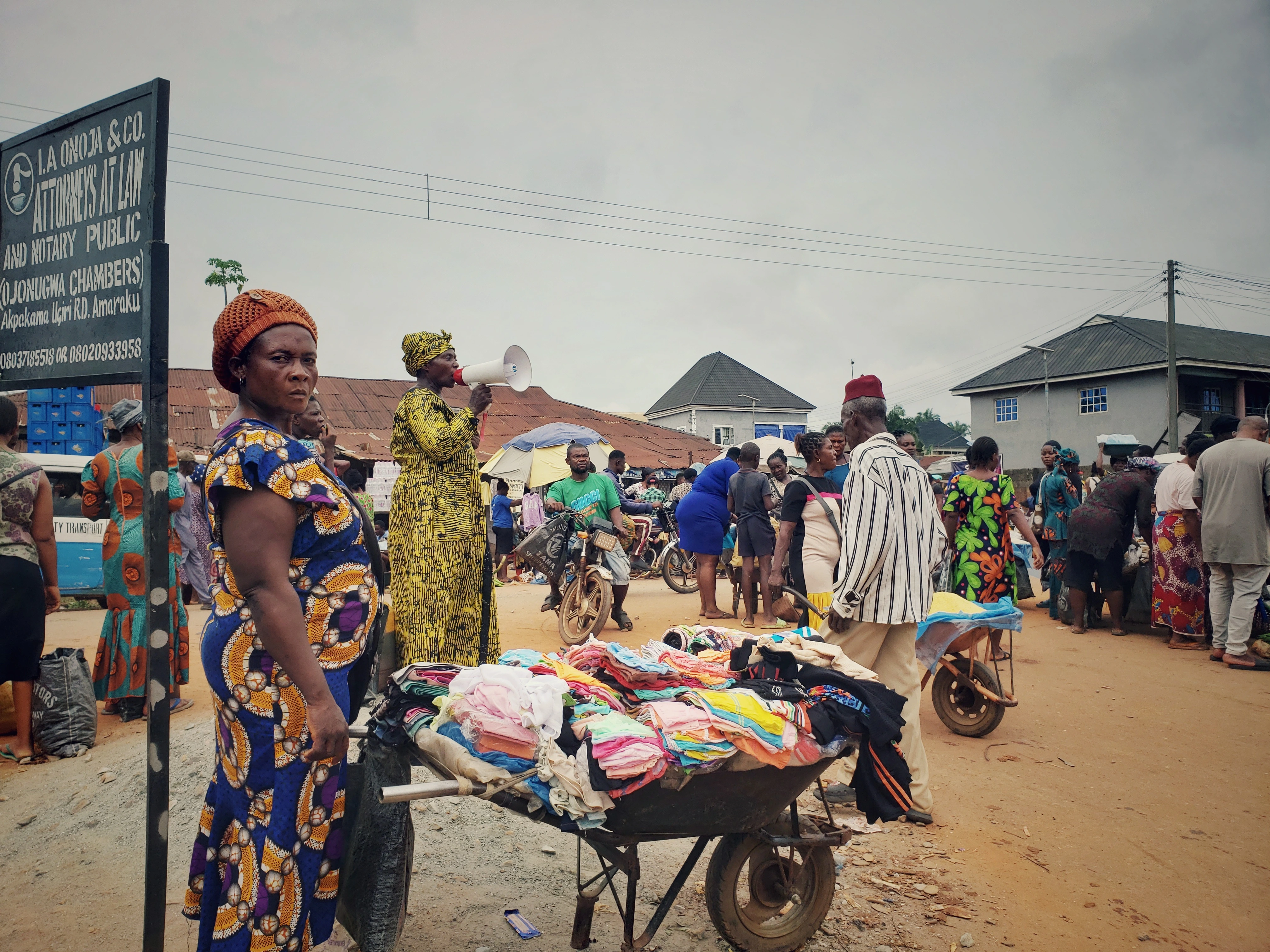 their sustenance; people who, like me, have come to watch the turbulence; angry teenagers who would rather be somewhere else than neck-deep in mountains of vegetable; people buying fake trinkets ₦300 a piece. Since I have long lost count of the market days, it is a delightful coincidence that the very day I choose to visit is a market day. It is also my mother’s birthday, so I stop at her stall to sing for her, Ada Nwaanyịọcha. She turns her back to the camera, places both hands on her waist, and smiles at her neighbor. The neighbor's grandchild, whom I can see at the far right, looks at me. Orie Amaraku is not where you come to buy smiles, but once in a while, an angel glides past and tickles a person or two.